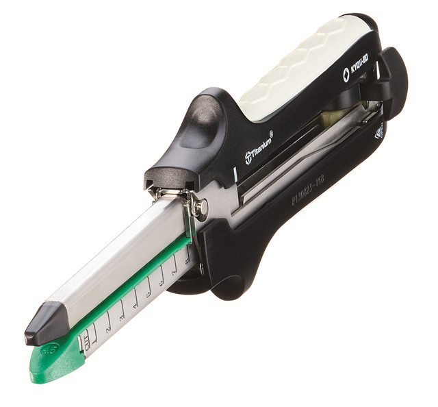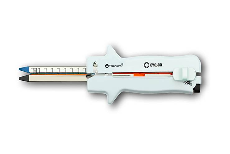 一次性使用直線型切割吻合器提供左右各兩排交錯(cuò)的鈦釘,可同時(shí)閉合并切割兩組鈦釘之間的組織。